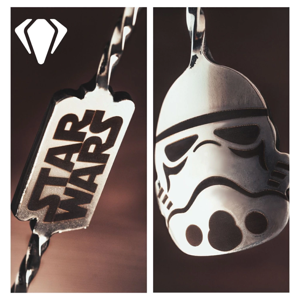 En un extremo, el emblemático símbolo del Imperio Galactico, mientras que en el otro, la sombría imagen de la Tropa del Imperio recuerda el desafío constante entre la luz y la oscuridad.